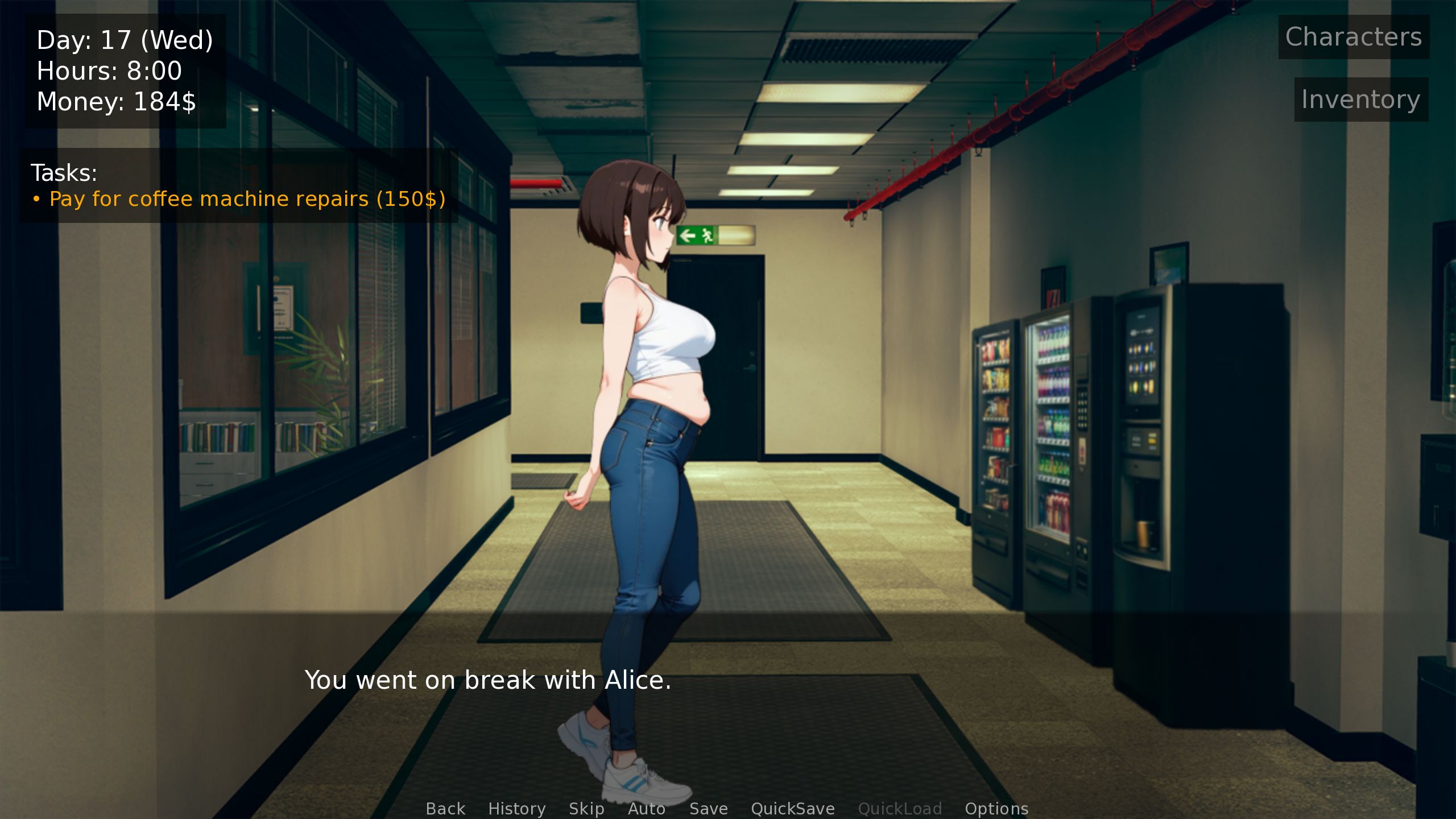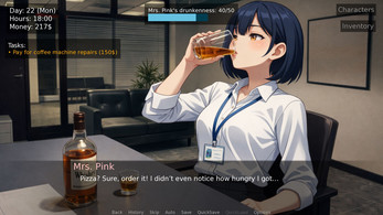 Been playing since 0.2 and I'm digging the gameplay loops! You have cash pretty well-balanced once you get a raise since there are so many different things to spend it on. I will say though that if you keep adding characters that there really won't be enough income for you to be able to stay on top of keeping them all fed. Especially with your boss being a pit you throw your money into at the end of every day. I assume it'll get even worse with persuasion options being added for the two characters missing them. It means you'll be spending $20 at the beginning of every work day to taxi everyone to work and that will get bad fast. Maybe adding options for passive income is the way to go? Investing books you can buy from the store or something?